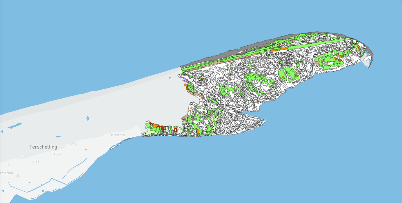 Oost-Terschelling grove duintypen Data betreffende jaar-op-jaar veranderingen van deze kwelders worden naast transectmetingen en vlakdekkende vegetatiekaarten gebruikt om de ontwikkelingen in het kwelderareaal en de vegetatie in relatie tot opslibbing, waterstanden te volgen, voor beheeradviezen en nationaal en internationaal (TMAP) beleid en voor rapportageverplichtingen in het kader van Europese wetgeving. Vegetatiedatabase (opgebouwd uit vlakken) van gebieden aan de kust (kwelders, groene stranden en duinen), ingewonnen op basis van luchtfoto's 1:5.000 of 1:10.000 en veldwerk. Inwinning per gebied gebeurt in een cyclus van 6 jaar. De database bevatafgeleide informatie waarmee, naast de vegetatiezoneringskaart ook een vegetatiestructuurkaart en een rode-lijst-kaart gemaakt kunnen worden. Via de servicedesk-data van Rijkswaterstaat is een vertaaltabel beschikbaar van Salttype naar betreffende afgeleide. De database is samengesteld uit vegetatiekarteringen die zijn ingewonnen op basis van classificatie volgens Salt97 en Salt08. Tot en met 2007 zijn vegetatiekarteringen ingewonnen aan de hand van Salt97. Bij deze karteringen werden per gebied lokale vegetatietypen onderscheiden. Met de komst van Salt08 is de typologie geharmoniseerd. Karteringen tot en met 2007 zijn vertaald naar de Salt08 typologie.